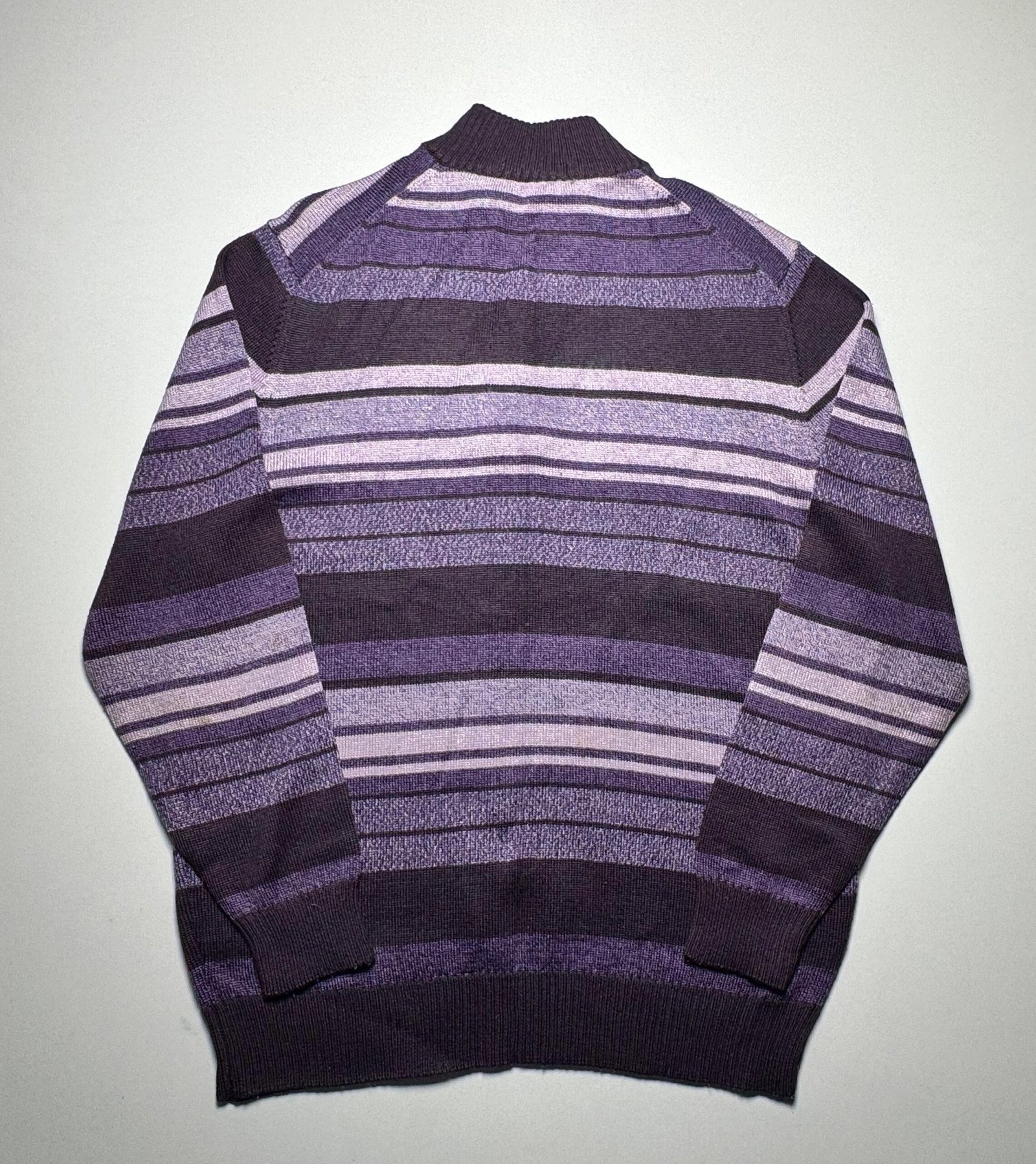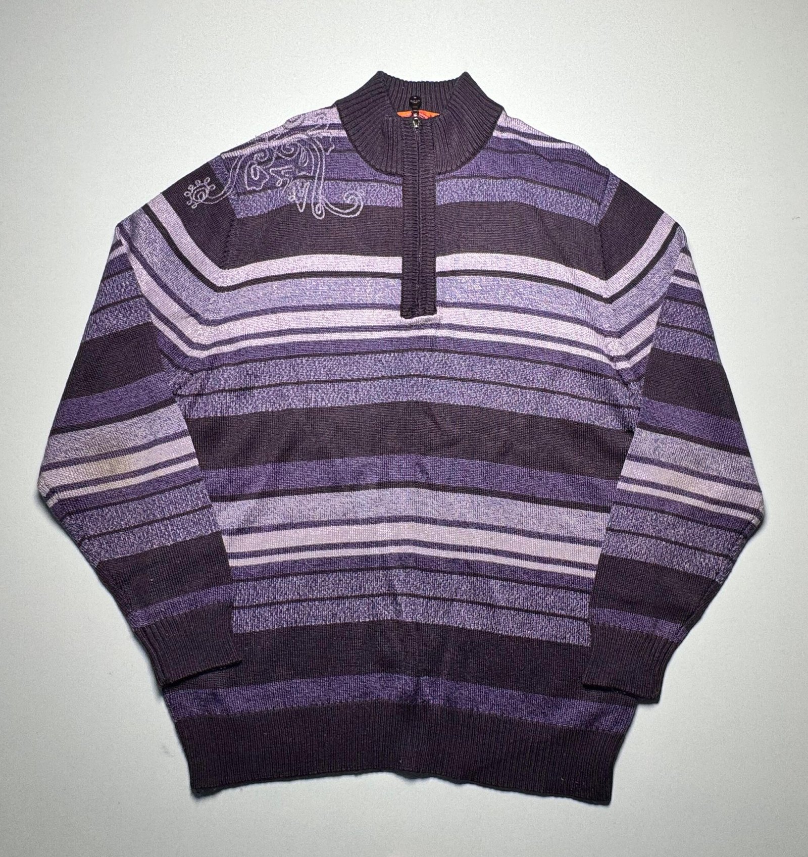 Make a statement in this eye-catching quarter-zip sweater, featuring bold horizontal stripes in various shades of purple, plum, and black. The standout detail is the intricate, swirling artistic print across the upper chest/shoulder area, which gives the piece a unique and modern edge. Finished with a cozy mock neck and zip closure, this sweater blends comfort with a unique, fashion-forward flair.