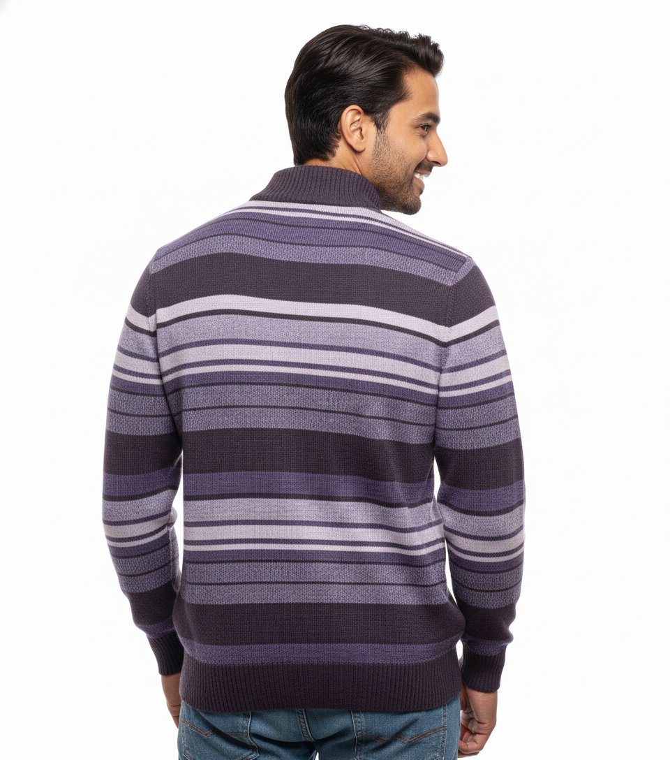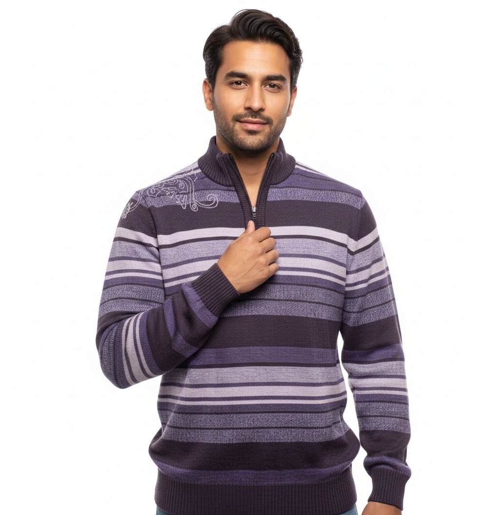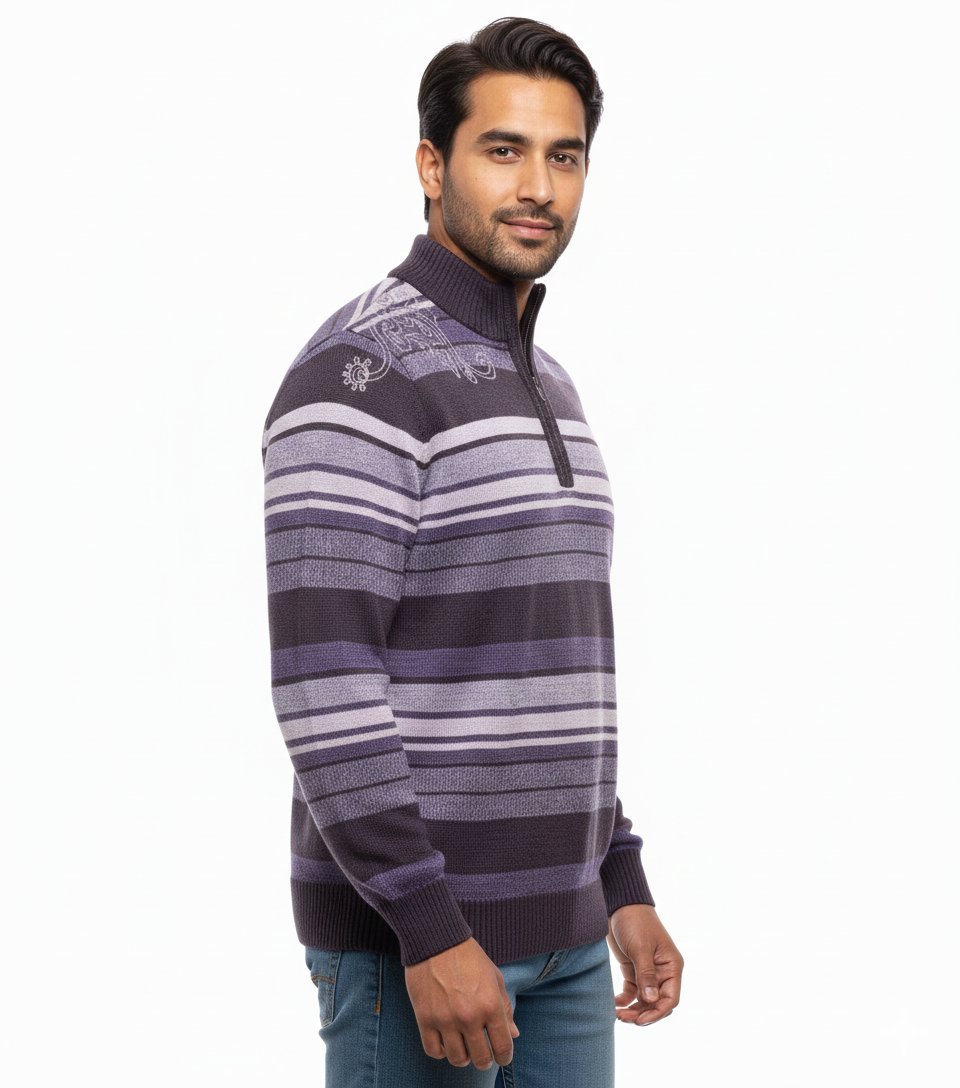Be the first to review “Bold Striped Quarter-Zip Sweater with Artistic Shoulder Print” Cancel reply