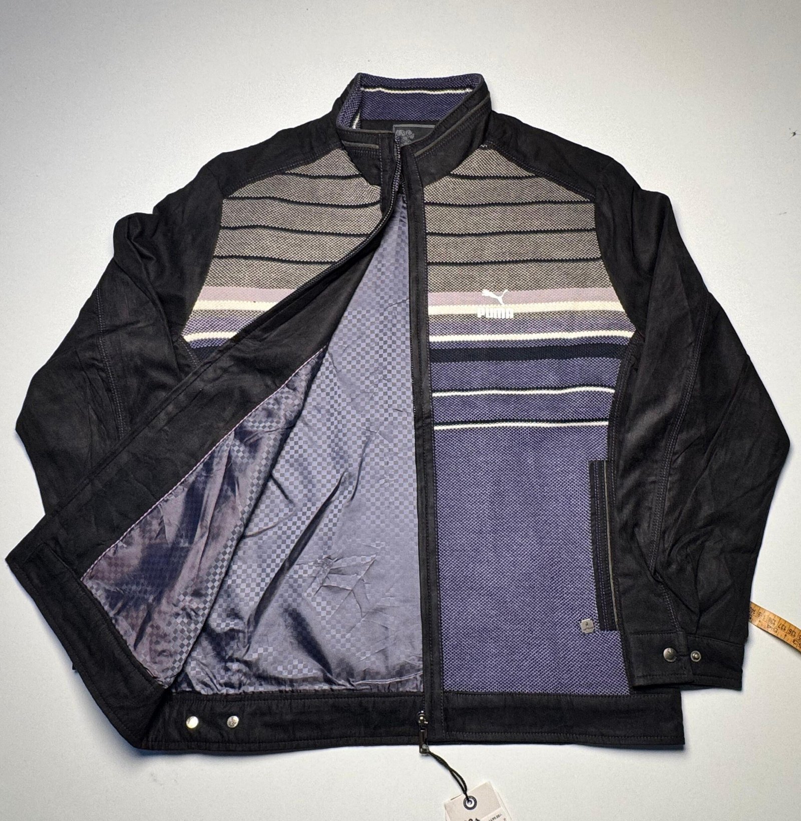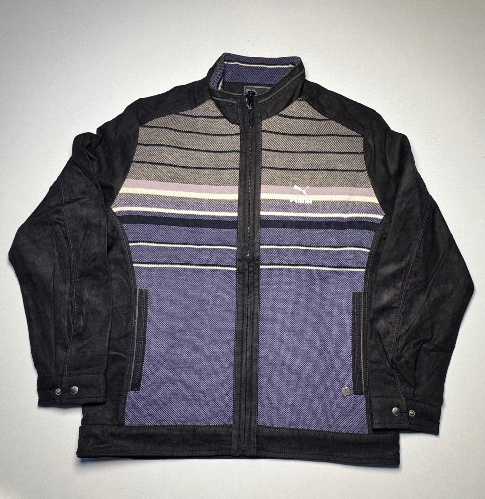 Description: A versatile full-zip jacket defined by its mixed-media construction. The garment combines solid black sleeves and side panels with a textured, vertically paneled front featuring various horizontal stripes. The funnel neck and metal hardware give it a clean, structured silhouette, while the inner lining adds comfort.