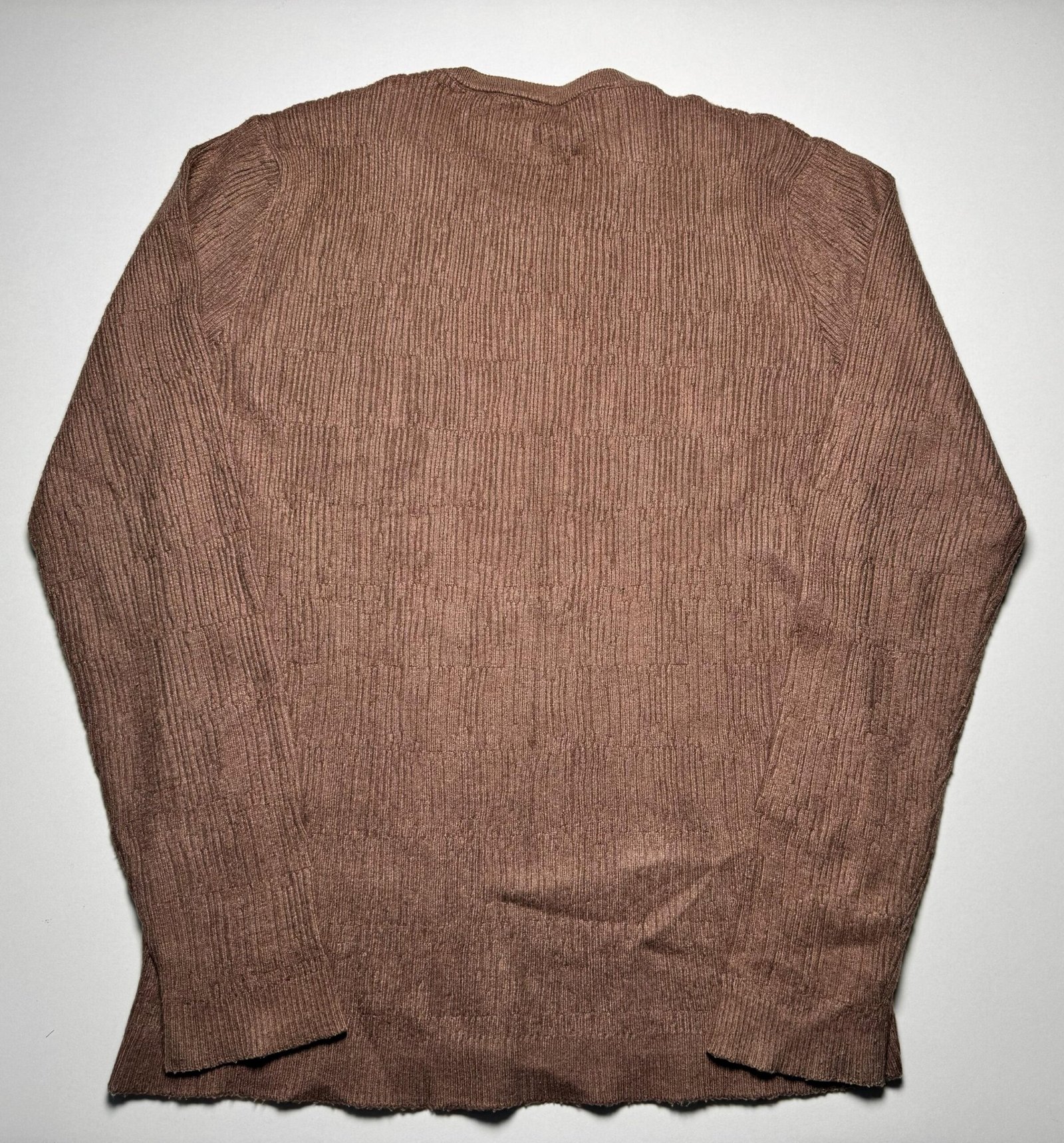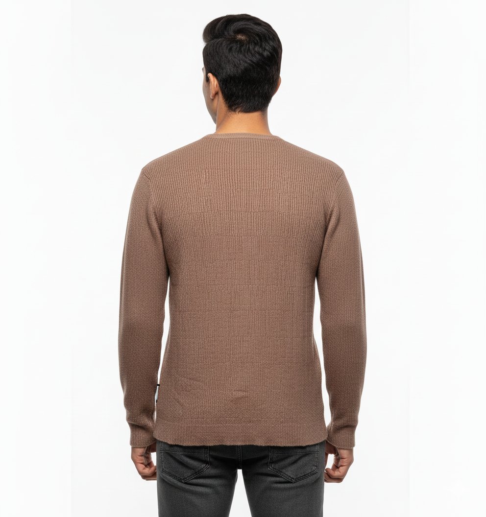 A comfortable and stylish sweater perfect for transitioning seasons. The rich mocha/brown color is complemented by a structured vertical texture across the body and sleeves. The relaxed fit and classic crew neck make it an effortless piece for layering over shirts or wearing on its own