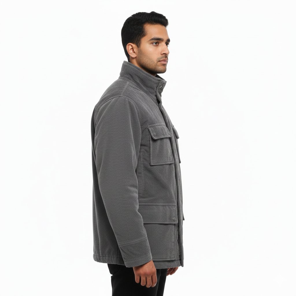 Stay warm in style with this premium grey corduroy winter jacket. Designed with a soft inner lining, multiple utility pockets, and a comfortable high-neck collar, it offers both warmth and functionality. Perfect for everyday winter wear, this jacket combines durability, comfort, and a classic look.