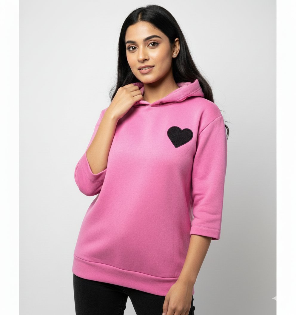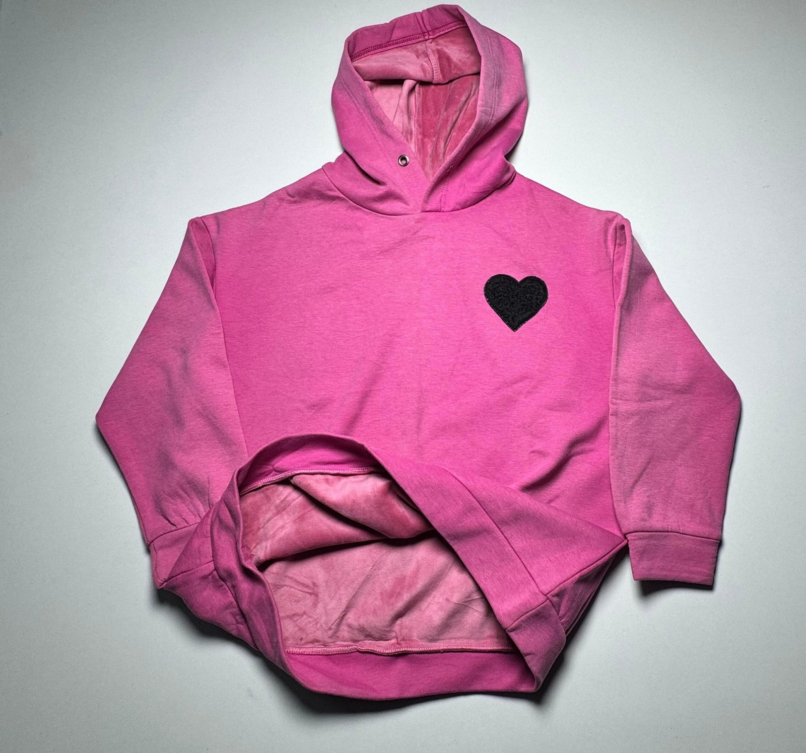 Designed for comfort and color. This striking pink hoodie is ultra-soft and features a delightful black velvet or fuzzy heart patch detail. The relaxed fit and plush interior lining ensure maximum warmth and coziness for play or relaxation.